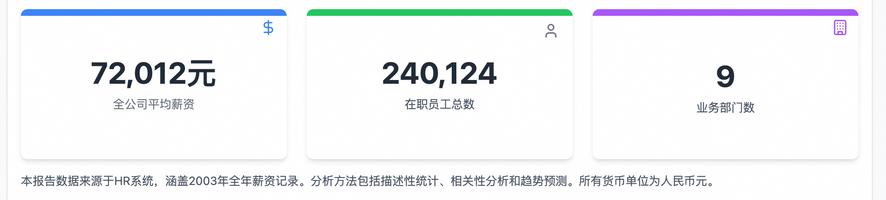 "description": "数据说明文本块(Text布局),深灰色文字。内容:\u201c本报告数据来源于HR系统,涵盖2003年全年薪资记录。分析方法包括描述性统计、相关性分析和趋势预测。所有货币单位为人民币元。\u201d左对齐,标准字号。",