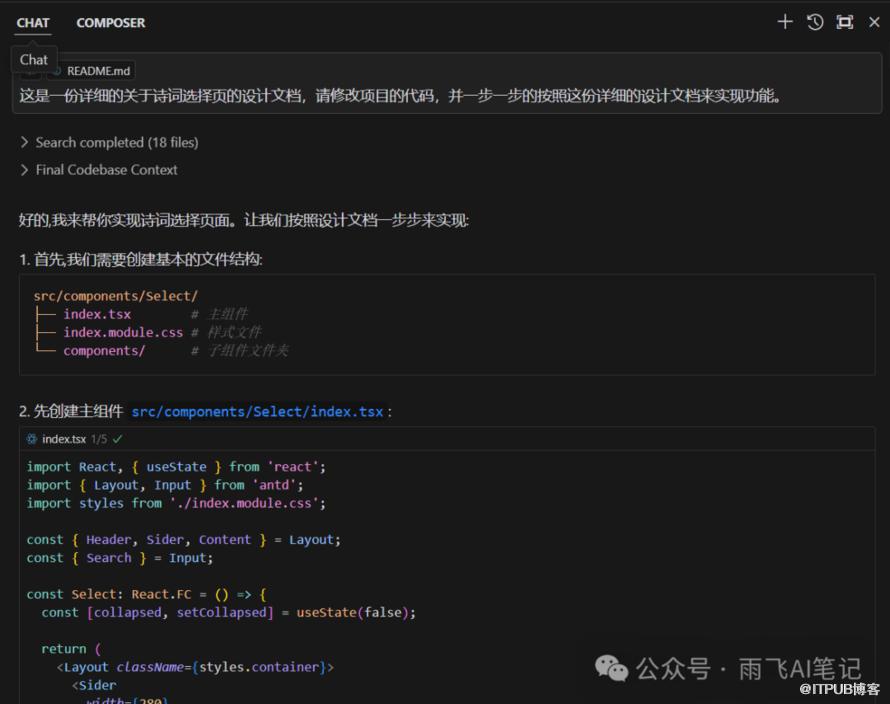 然后根据Cursor输出的内容,依次去实现各个组件。记住,每实现一个组件后,都要确认下功能是否正常。这也是避免代码写了一大堆,结果存在异常无法执行的情况。另外,每实现一个组件后也要确保之前的功能没有受到影响。由于我们这个项目的代码文件过多,盲目的一键自动Apply可能会带来很多麻烦事。一定要谨记。