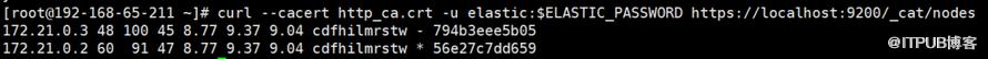 curl --cacert http_ca.crt -u elastic:$ELASTIC_PASSWORD https://localhost:9200/_cat/nodes