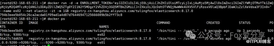 docker run -e ENROLLMENT_TOKEN="" --name es02 --net elastic -it -m 1GB registry.cn-hangzhou.aliyuncs.com/tulingfox/elasticsearch:8.17.0token替换为第一步生成的注册令牌。
