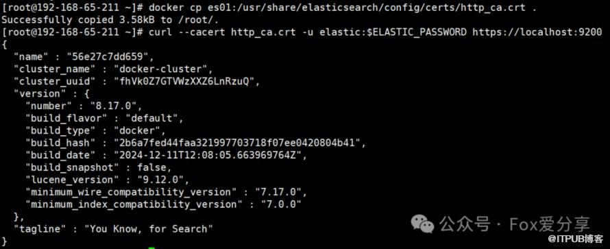 docker cp es01:/usr/share/elasticsearch/config/certs/http_ca.crt .7)通过发送 REST API 请求来确认 Elasticsearch 容器是否正在正常运行。