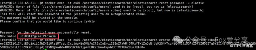 5)复制生成的elastic密码和注册令牌。这些凭证仅在第一次启动Elasticsearch时显示。可以使用以下命令重新生成凭据。