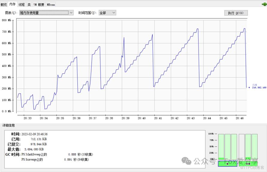 选择“内存”标签页,你能看到 Tomcat 进程的 JVM 内存使用情况。