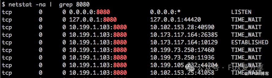 4. 查看 Tomcat 的网络连接,比如 Tomcat 在 8080 端口上监听连接请求,通过下面的命令查看连接列表: