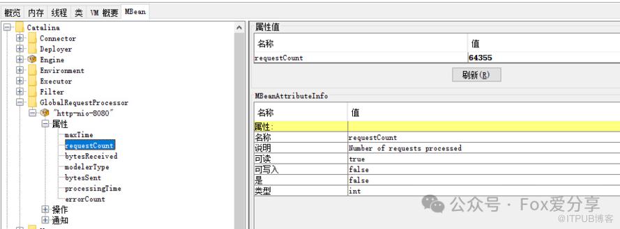 在 MBeans 标签页下选择 GlobalRequestProcessor,这里有 Tomcat 请求处理的统计信息。你会看到 Tomcat 中的各种连接器,展开“http-nio-8080”,你会看到这个连接器上的统计信息,其中 maxTime 表示最长的响应时间,processingTime 表示平均响应时间,requestCount 表示吞吐量,errorCount 就是错误数。