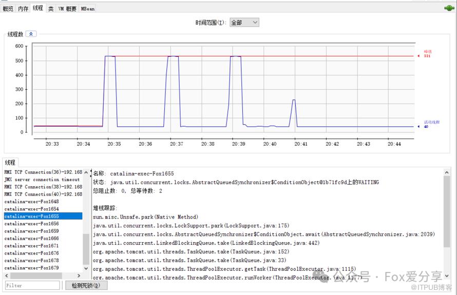 选择“线程”标签页,可以看到当前 Tomcat 进程中有多少线程,如下图所示: