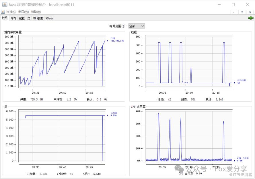 jconsole x.x.x.x:8011我们可以看到 JConsole 的主界面: