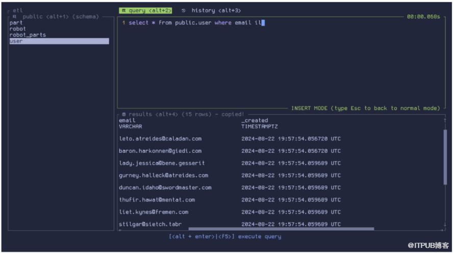 rainfrog 是一个轻量级的、基于终端的 pgadmin/dbeaver 替代品。它具有类似 Vim 的按键绑定用于导航和查询编辑,提供预览行/列/索引的快捷方式,以及快速遍历表格和模式的能力。
