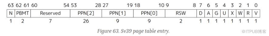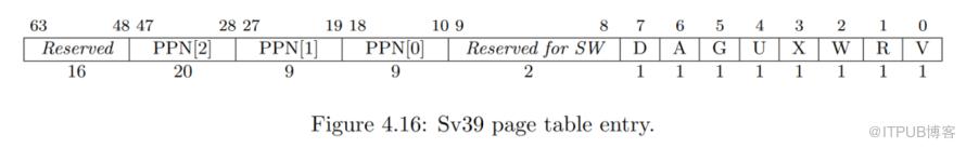 Sv39 的 PTE 格式如图 4.16 所示。位 9–0 的含义与 Sv32 相同。位 63–48 保留供将来使用,必须由软件清零以实现向前兼容。