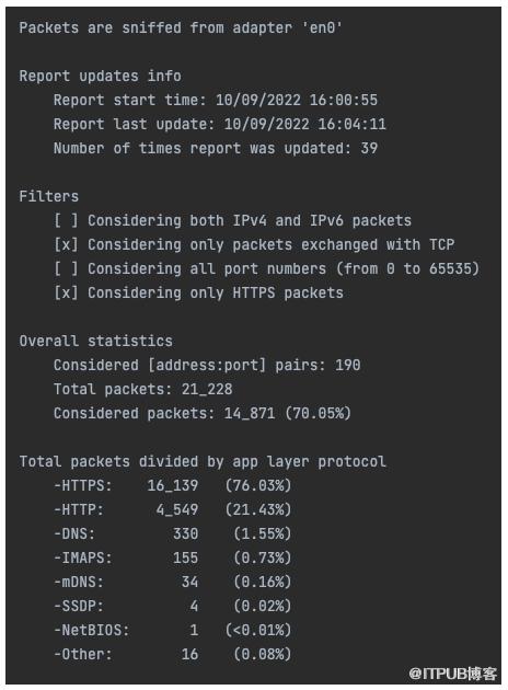 Sniffnet 是该作者发布的第一个 rust crate,该框架由网络数据包嗅探器/过滤器组成,可以生成图形和文本报告,并提供丰富的统计信息。输出结果如下图所示。