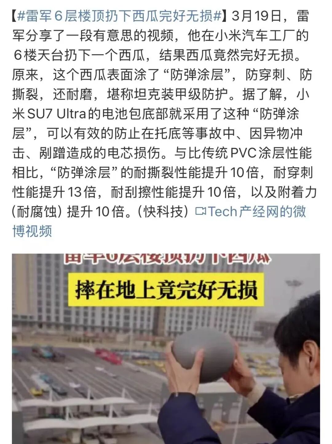 更荒诞的是,当宁德时代紧急声明“涉事车辆未用我方电池”,公众却盯着雷军三年前“电池安全是生死线”的演讲片段,质问:雷总扔西瓜测试的底气呢?
