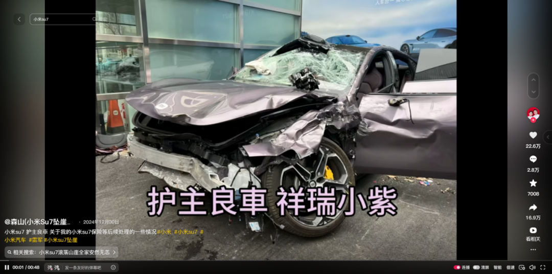 这起事故被剪辑成“小米铠甲车身”的宣传片,仅车主自己在抖音发布的视频,就收获了22.6万点赞,评论区涌入上百条“雷神护体”的评论,并有多家官方媒体转发,全网播放量以亿计数。