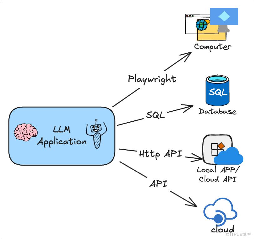 假如你开发了一个AI应用,无论是ChatBot还是复杂的Agent,都不会再局限于简单的LLM对话,很多时候你需要与外部世界连接,以访问数据源或使用工具。比如: