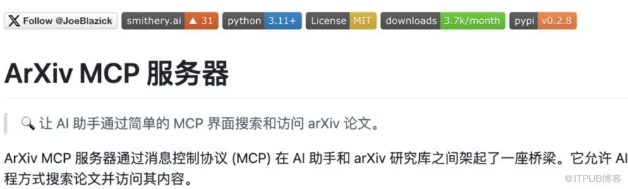 这是一个用来访问ArXiv上论文的MCP Server,提供了搜索、下载等工具。根据它的说明,先安装(注意不同MCP Server安装命令不一样):