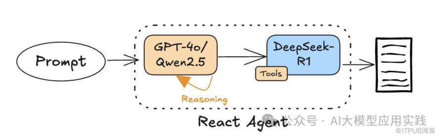 这种方法的思想是借助Agent的思想,让deepseek的深度思考作为一个Agent可以使用的工具,在这个工具(使用deepseek模型)获得思考结果后,再通过结构化输出的模型进行格式化(使用gpt-4o模型)。概念如下图: