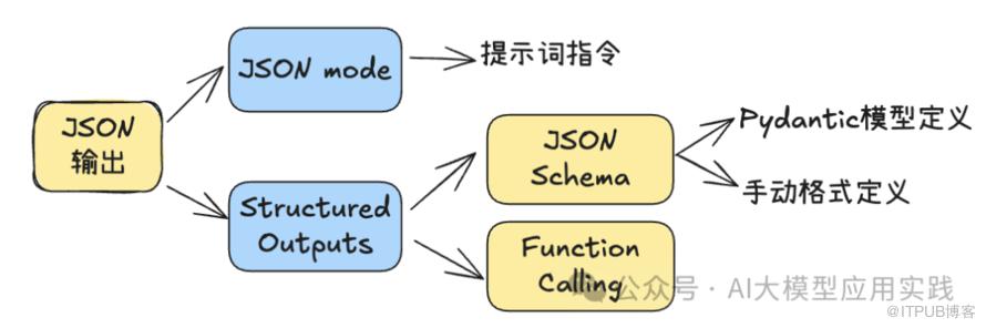 JSON mode:需要使用提示词进行限定,并在API参数中指定响应格式为json_object,这种方式可以确保输出有效的JSON格式,但具体格式需要借助提示(目前一些模型还只支持这种方式,比如阿里的qwen)。