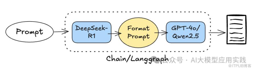这种方法融合DeepSeek-R1的深度思考能力与通用模型的结构化输出能力(如GPT-4o):将R1的推理结果借助一个“辅助”模型进行“格式化”后输出,概念流程如下: