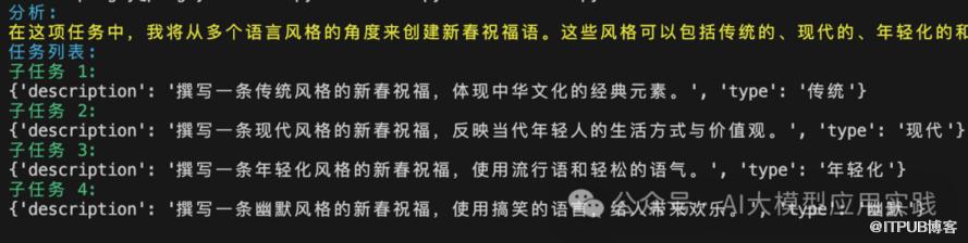 由于这里只是简单的内容生成任务,而且下游的Worker也是动态创建的通用LLM调用,因此处理过程相对简单。在实际应用中,也可能有一些更复杂的考虑,比如:是否可以给Workers划分多个任务角色,每个Worker角色可能有不同的提示与“工作职责”,这时候Orchestrator就需要参考Worker的信息来决定子任务如何分解,而且,分解后的子任务就需要根据任务类型创建对应职责的Worker来完成。