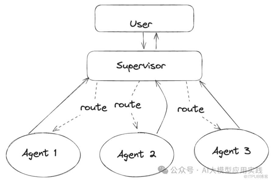 在多Agent系统中有一个在拓扑上类似的Supervisor模式。即一个管理Agent来负责任务的分配与组织,多个工作Agent配合完成具体工作: