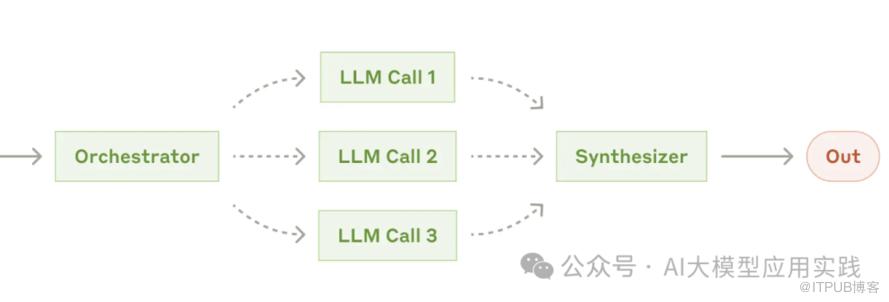 编排者-工作者模式是这样一种模式:由一个LLM调用对任务进行分解,并将分解后的子任务交给多个“增强LLM”一起完成,最后将子任务的响应合并输出。