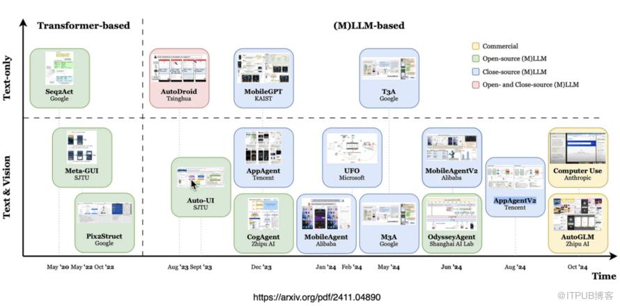 最近两年来,随着大模型的兴起,GUI Agent也不断有新的工具与平台推出,下图展示其中一些重要项目: