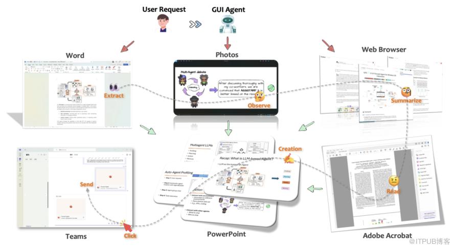 GUI Agent是核心的执行者,负责解析用户请求、推理、并协调多应用之间的任务,并自动打开不同的应用程序来执行: