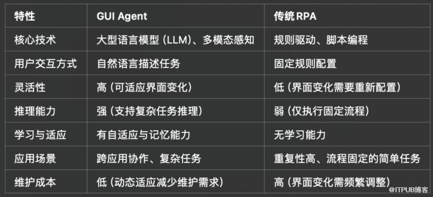 最后,我们来比较GUI Agent与传统RPA的差异: