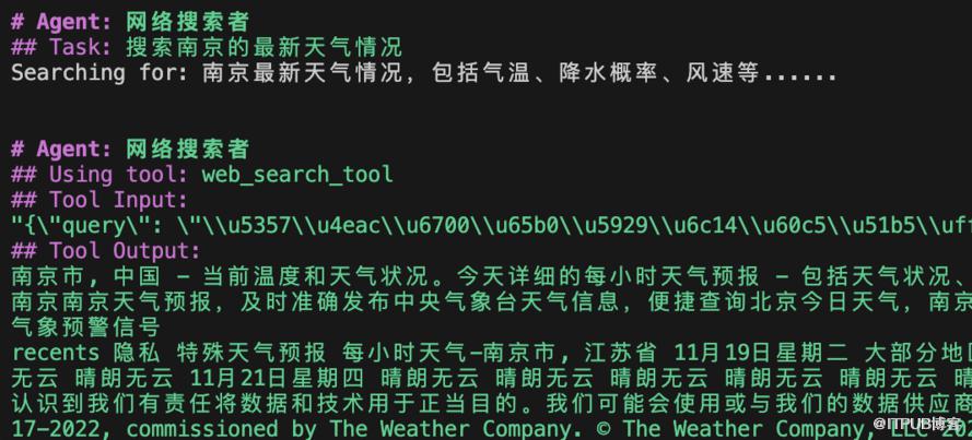 1. 首先管理Agent判断出需要执行搜索任务,并把任务交给了搜索Agent,这个Agent会使用web_search_tool来执行任务,获得工具的响应,然后输出结果: