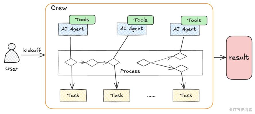 CrewAI的核心概念是Crew。简单的总结Crew:Crew就是多个智能体组成的小团队。团队中的多个智能体(Agent)根据设定的流程策略(Process),借助必要的工具(Tools),自主协作完成一系列任务(Task)。