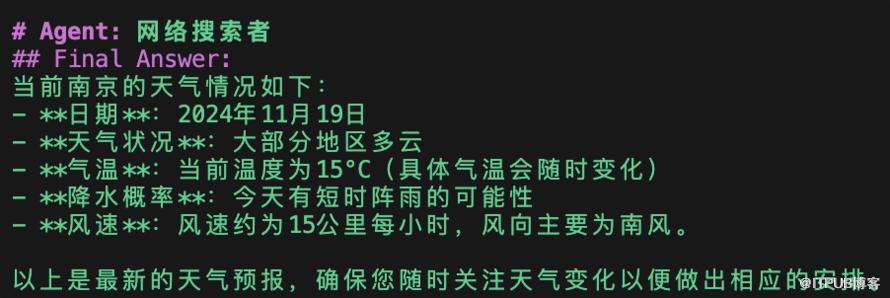 可以看到,CrewAI中团队的各个Agent遵循ReAct行动范式来自主完成任务执行流程,并最终输出结果。