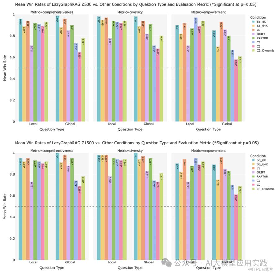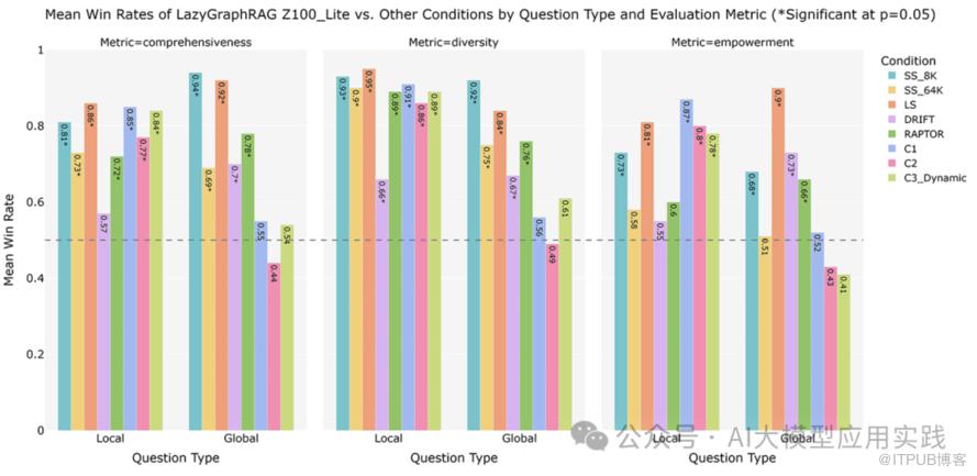 • LazyGraphRAG 在全局查询上的表现稍弱于其本地查询的表现,但在综合性和多样性指标上仍处于领先位置。