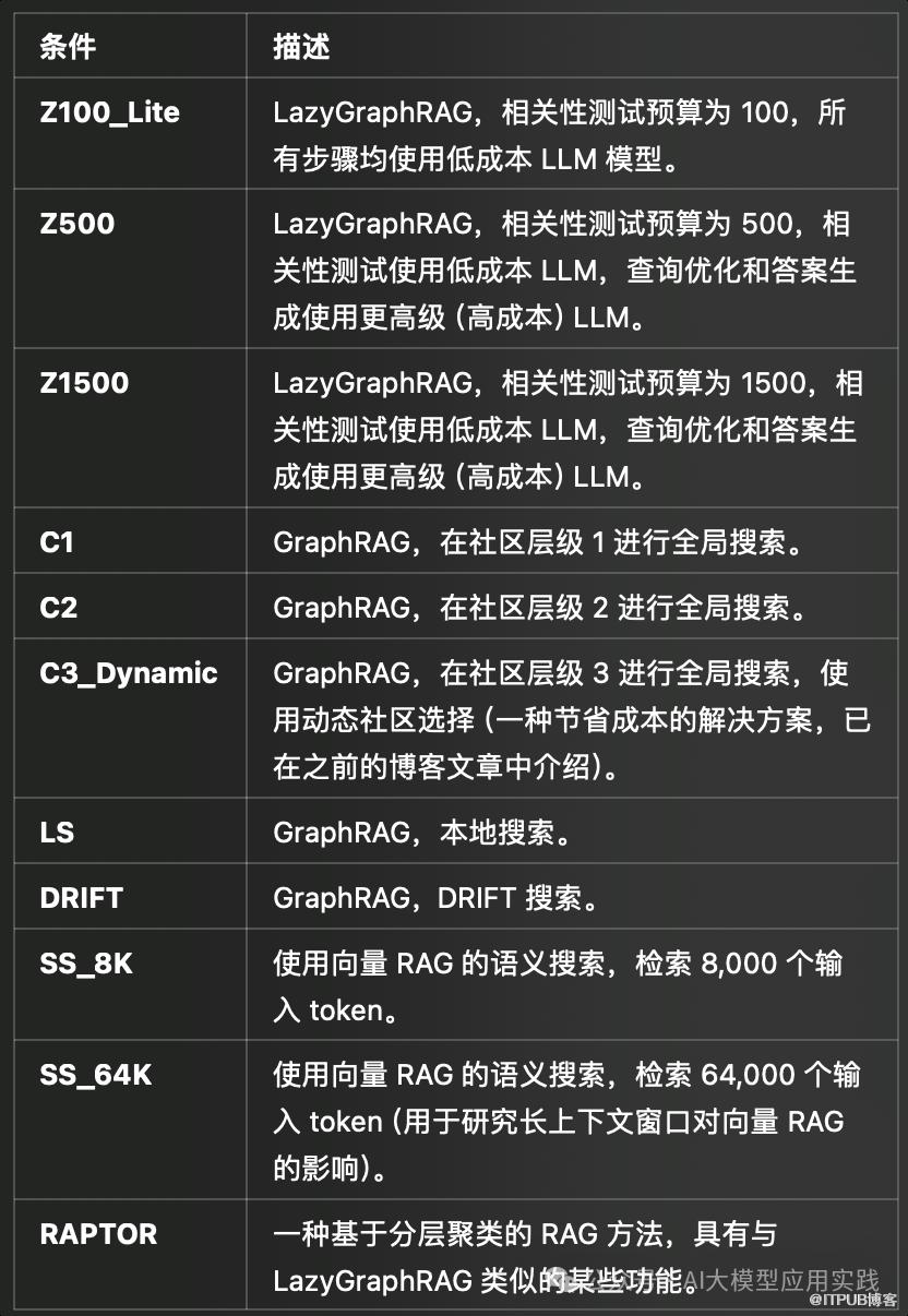 微软在不同的相关性测试预算水平下,对 LazyGraphRAG 与一系列竞争方法进行了比较,具体环境如下: