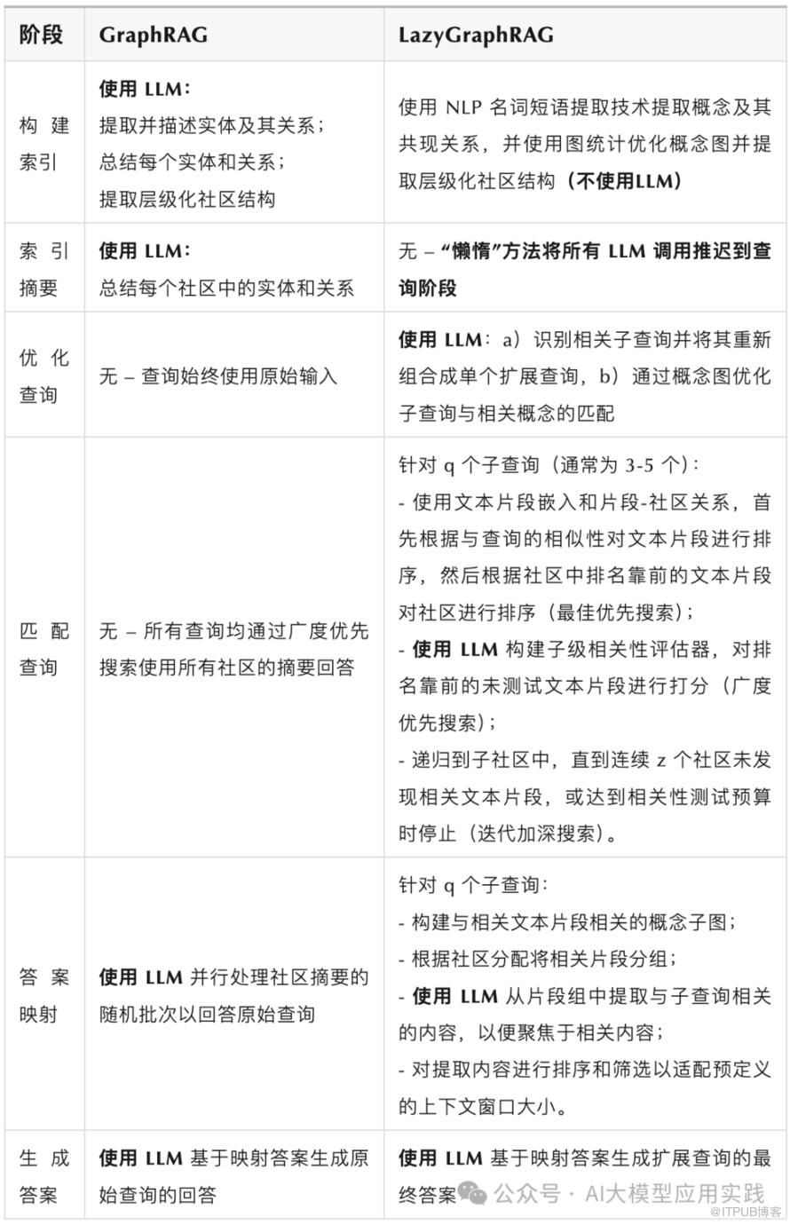 上表中,完整的展示了LazyGraphRAG与GraphRAG在从索引到查询阶段(主要是全局查询)的处理环节的区别。可以看到,两者最主要的区别是: