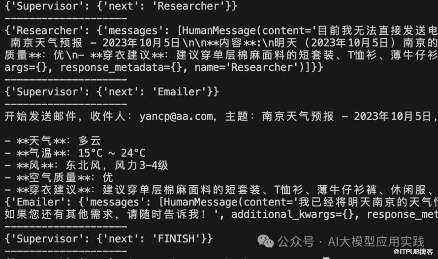 print("--------------------")在下图的输出结果中你可以很清晰的看到完整的Agent之间的协作过程:Supervisor首先判断需要调用Researcher这个Agent,在获得结果后,判断下一步需要使用Emailer这个Agent,最后判断可以结束任务(FINISH):