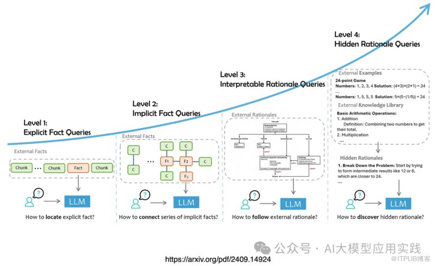 在微软的研究报告《Retrieval Augmented Generation (RAG) and Beyond: A Comprehensive Survey on How to Make your LLMs use External Data More Wisely》中,提出了一种对包括RAG在内的数据增强型LLM应用的查询任务的分层方法,将输入的查询任务根据需求分成了四个层次,对其进行了定义与解析,总结了不同层次的技术挑战与应对方案。本文将对其进行深入学习与理解。