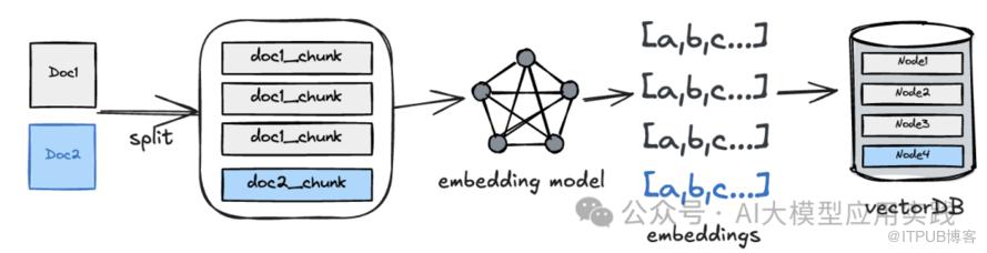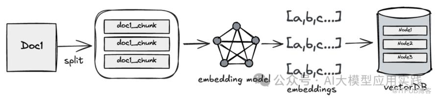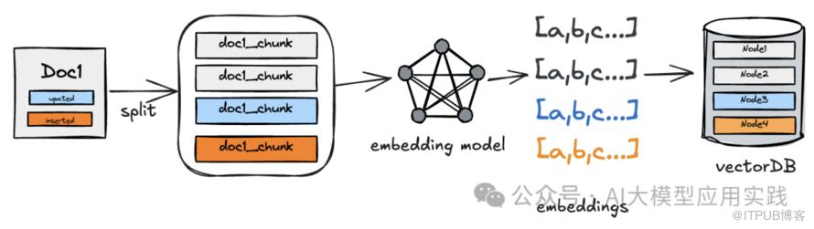一般来说企业的信息系统中都可能有较完善的知识库维护与管理应用,但是如何让变化的知识能够同步更新到RAG应用中则不一样,知识进入到RAG应用通常需要经过拆分(split)、嵌入(embedding)、向量索引(vectorindex)等步骤: