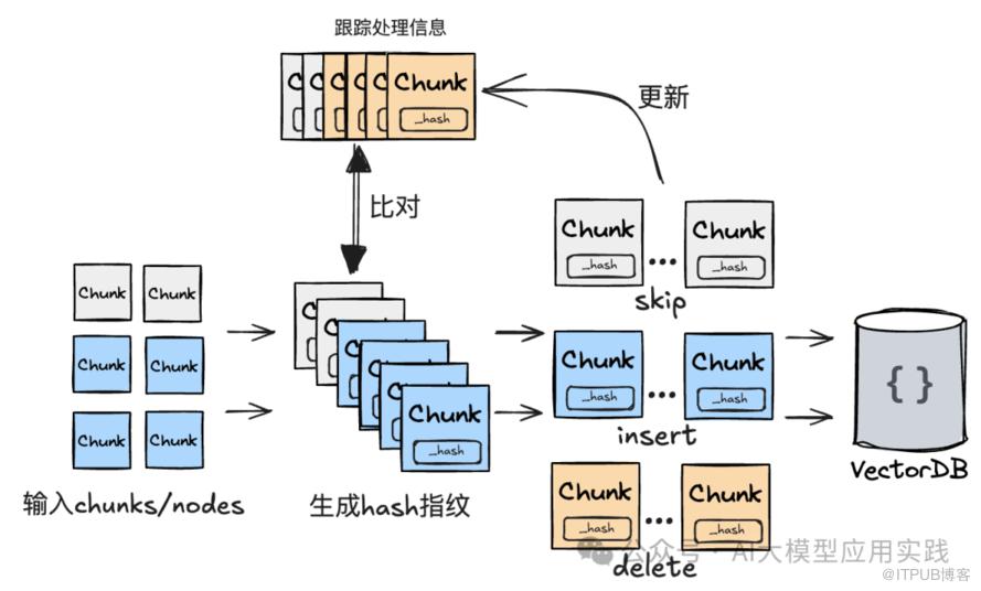 为了实现增量加载更新,需要一个跟踪与保存每次处理的块信息的机制(源文档、块信息、hash指纹、时间戳等),比如LangChain中的RecordManager组件,LlamaIndex中的DocumentStore组件