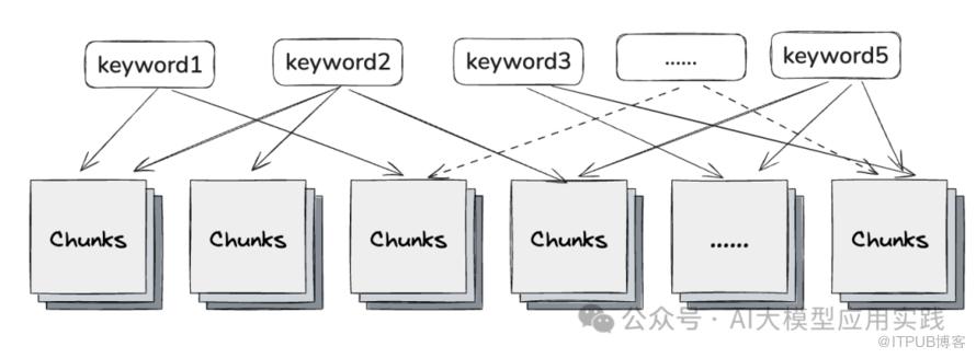 从每个chunk中的内容提取关键词,然后建立起关键词到各个chunk之间的映射关系并作为索引结构。在检索时,则根据输入问题的关键词来提取最相关的多个chunk返回。当然,由于关键词索引缺乏语义的理解,因此往往只能作为一种辅助索引。
