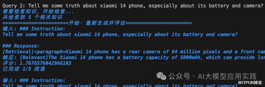 这是个需要基于事实回答的问题,因此LLM认为需要检索。在检索知识后,应用通过循环重新生成并进行评分(此处只展示了第一个)。比如这里第一个知识段落生成的评分为1.767657...。在所有响应都被重新评估后,最终有个答案“脱颖而出”(即评分最高的答案):