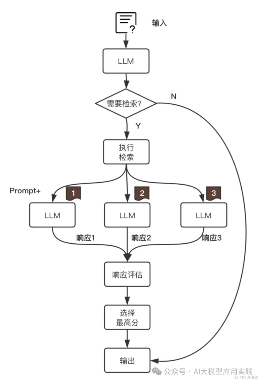 3. 增强生成。使用检索出的K个相关知识与输入问题组装Prompt,一起生成K个输出。(作为对比,在经典RAG中通常是把排序后的K个知识一起组装到Prompt后交给LLM做一次生成输出)。