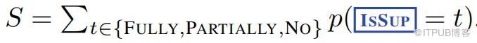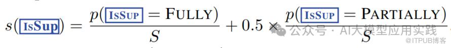 即用“fully supported”token的概率占本类型三种类型token概率和的比例,加上“partially supported”token的概率所占比例。但后者要乘以权重0.5。