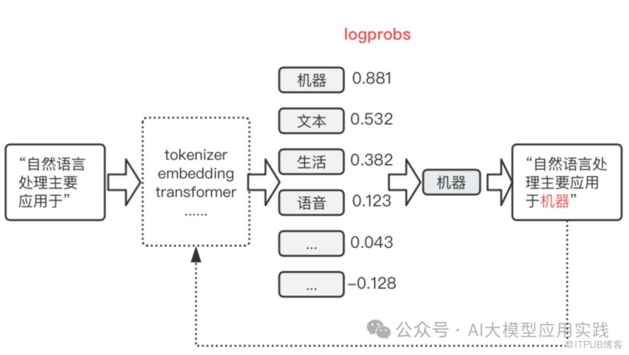 LLM最后从多个候选tokens中选择“机器”这个词输出,并将其附加到输入提示,进入下一次生成。而logprobs就是用来保存这里每一步预测时的多个可能的token概率(取对数,所以叫对数概率)。
