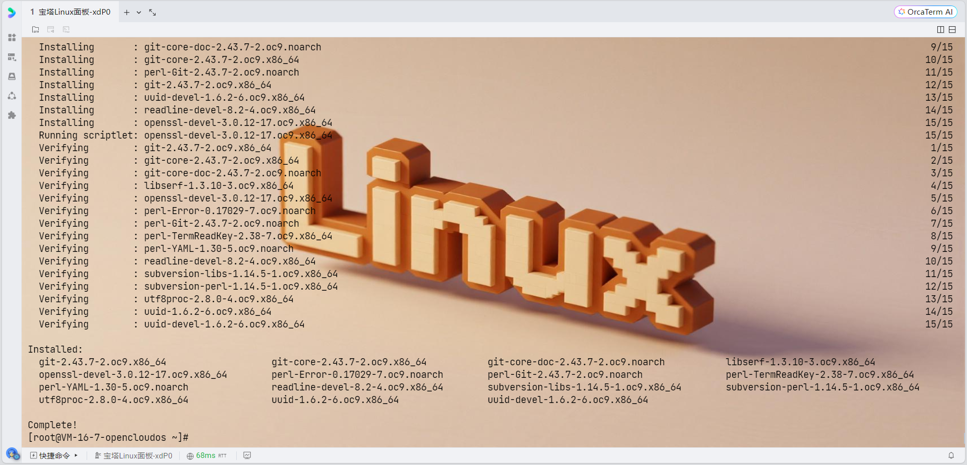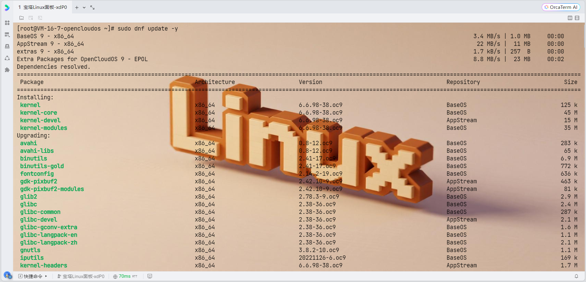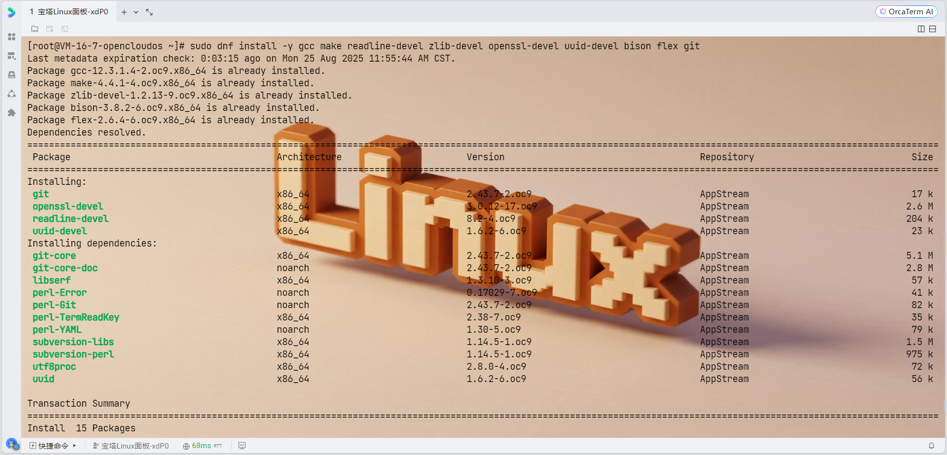 由于OpenCloudOS支持dnf和yum两种包管理软件,强烈推荐用户更多地使用dnf,我们使用dnf来安装依赖: