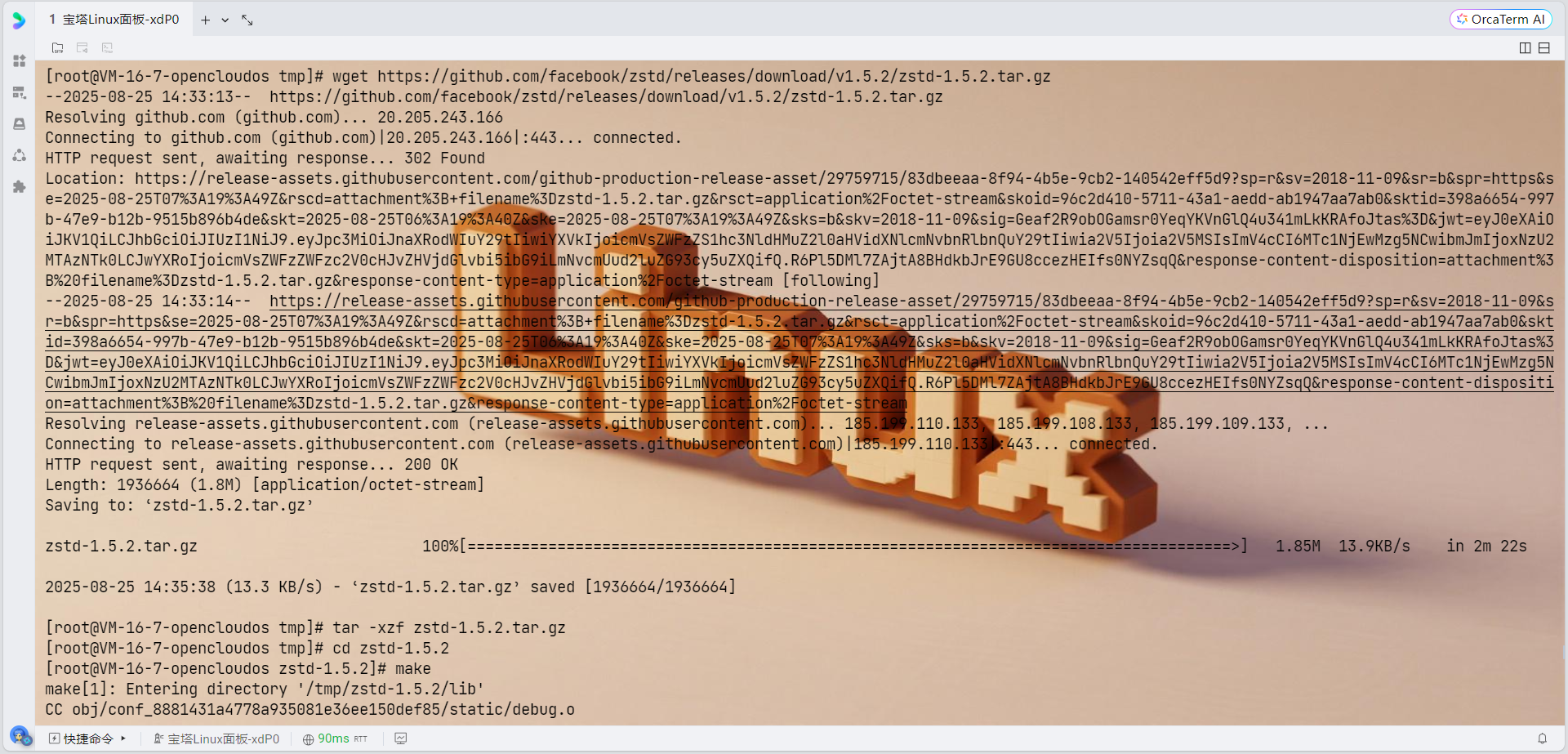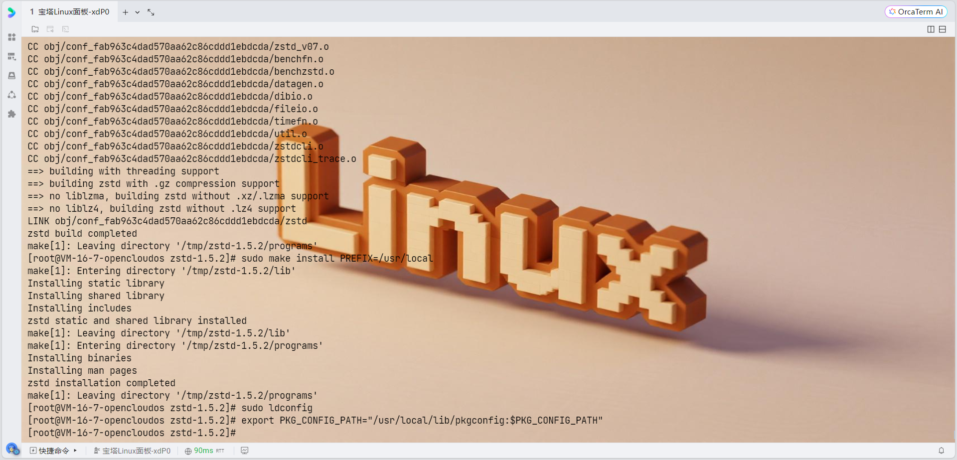 # 下载zstd源码 cd /tmp wget https://github.com/facebook/zstd/releases/download/v1.5.2/zstd-1.5.2.tar.gz tar -xzf zstd-1.5.2.tar.gz cd zstd-1.5.2 # 编译安装 make sudo make install PREFIX=/usr/local # 更新库路径 sudo ldconfig # 设置环境变量 export PKG_CONFIG_PATH="/usr/local/lib/pkgconfig:$PKG_CONFIG_PATH"