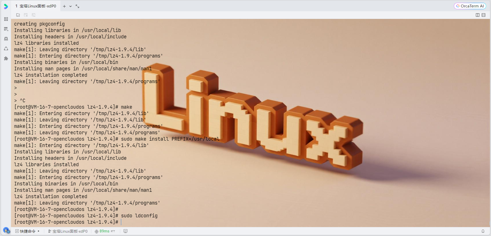 # 下载lz4源码 cd /tmp wget https://github.com/lz4/lz4/archive/v1.9.4.tar.gz tar -xzf v1.9.4.tar.gz cd lz4-1.9.4 # 编译安装 make sudo make install PREFIX=/usr/local # 更新库路径 sudo ldconfig # 设置环境变量 export PKG_CONFIG_PATH="/usr/local/lib/pkgconfig:$PKG_CONFIG_PATH" export LD_LIBRARY_PATH="/usr/local/lib:$LD_LIBRARY_PATH"