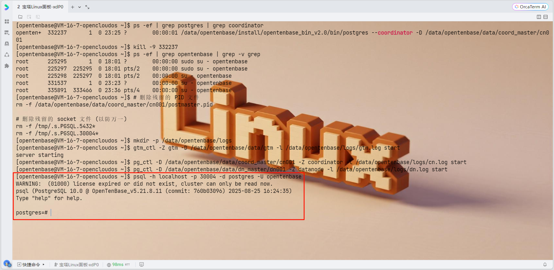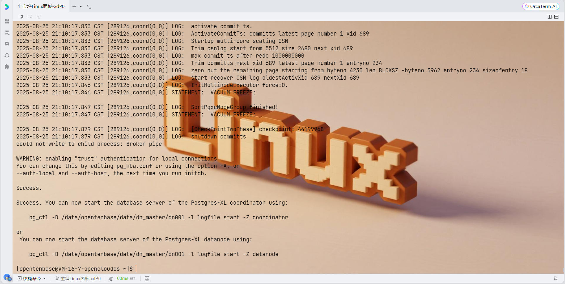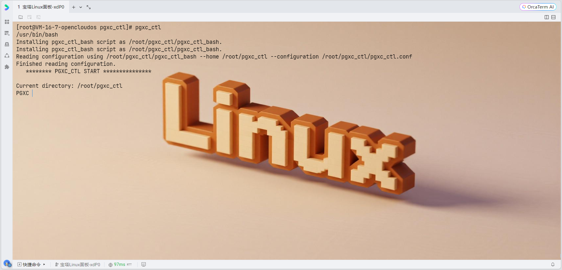 # 现在重新运行pgxc_ctl pgxc_ctl # 在pgxc_ctl中执行: deploy all init all start all monitor all