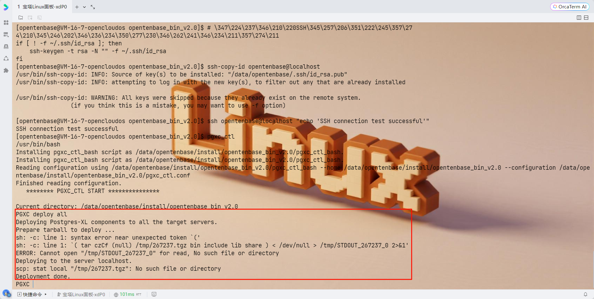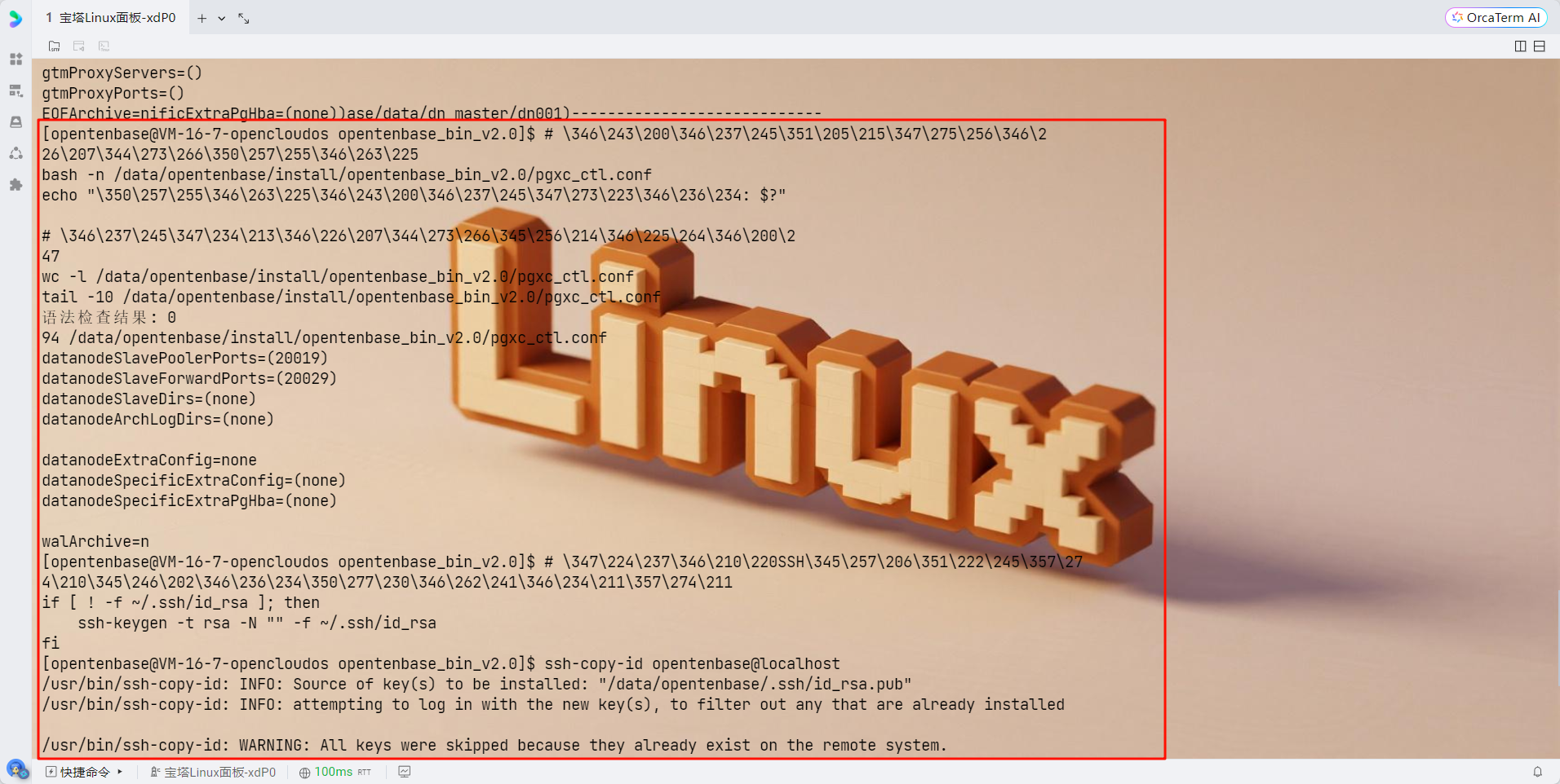 # 退出pgxc_ctl exit # 设置opentenbase用户的SSH密钥认证 su - opentenbase # 生成SSH密钥对 ssh-keygen -t rsa -b 2048 -f ~/.ssh/id_rsa -N "" # 将公钥添加到authorized_keys cat ~/.ssh/id_rsa.pub >> ~/.ssh/authorized_keys chmod 600 ~/.ssh/authorized_keys chmod 700 ~/.ssh # 测试SSH连接(应该不需要密码) ssh opentenbase@127.0.0.1 "echo 'SSH连接测试成功'" MQgnDKIwotjP9+vkGc9jehXXIzfXSJ2+ZAnFP5IDvIc.