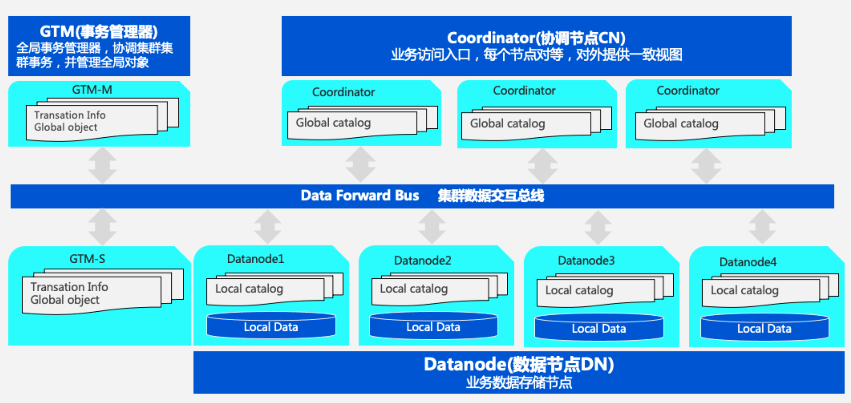 - GTM Node (Global Transaction Manager) :负责集群事务信息的管理,以及集群的全局对象(如序列)