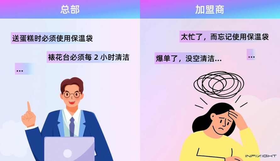 比如当秘境鹿屿总部要求所有门店外送蛋糕时必须使用保温袋,加盟商却总是会因为忙碌而忘记使用保温袋,影响蛋糕口感;当总部强调蛋糕间裱花台必须每 2 小时清洁消毒一次时,加盟店正为高峰期的爆单焦头烂额。 这种认知错位,本质是规模化与个性化的冲突——总部要的是可复制的标准,加盟商求的是门店营收。