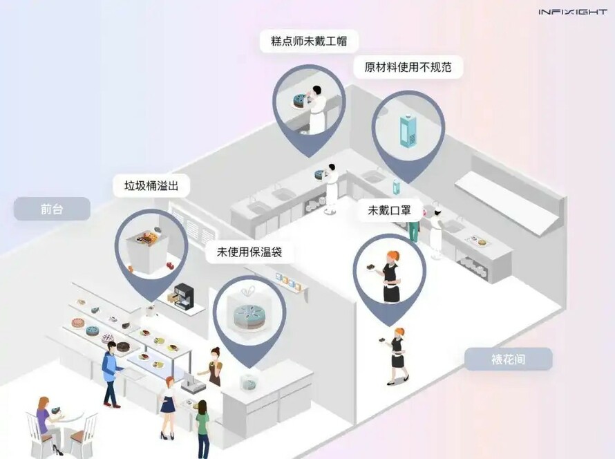 通过定时抓拍监控画面, AI 自动识别员工着装以及操作是否合规,蛋糕打包是否使用保温袋,以及奶油原料是否为官方指定品牌,一旦 AI 发现问题会立即自动告警;